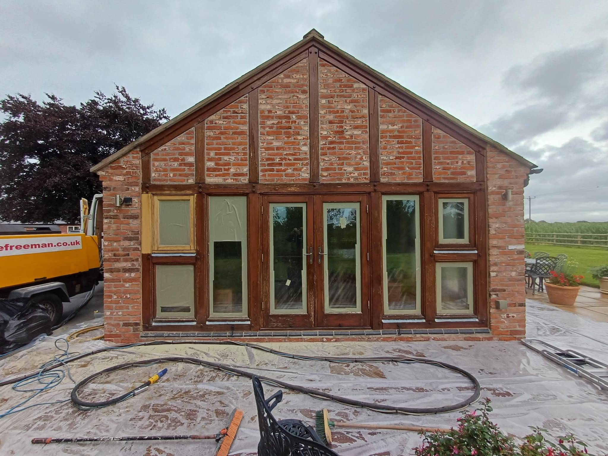 This project required careful media choice and our low-pressure soda blasting technique was chosen in order to ensure the glass was protected. The results were stunning as this outbuildings tired exterior was transformed into a fresh, new looking building.